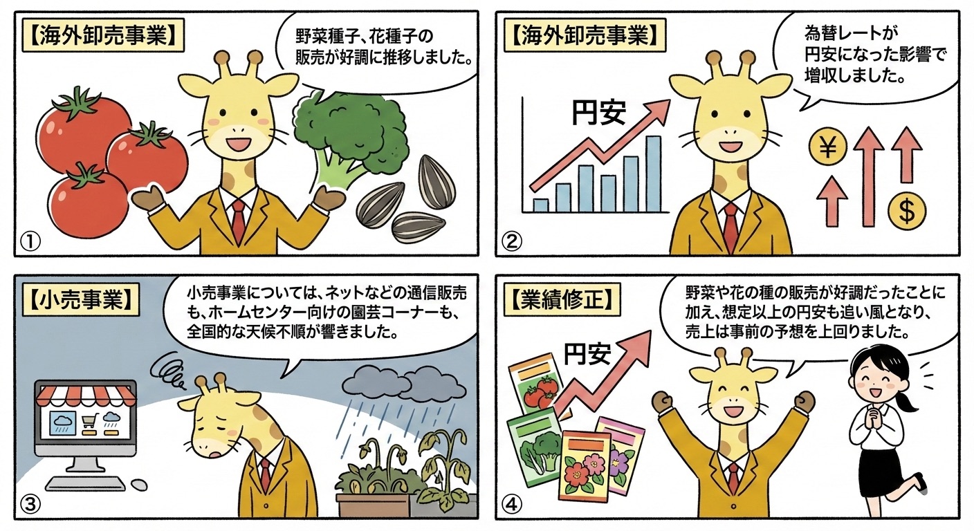 野菜や花の種の販売が好調だったことに加え、想定以上の円安も追い風となり、売上は事前の予想を上回りました。