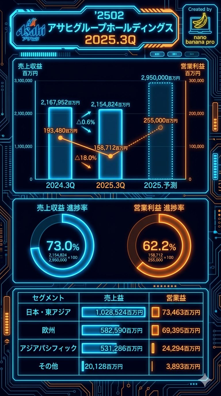 アジアパシフィック 主力のビールブランドやRTDのプレミアム化が堅調でしたが、物流費や人件費の増加、為替変動によるマイナス影響を受け、減収減益となりました。