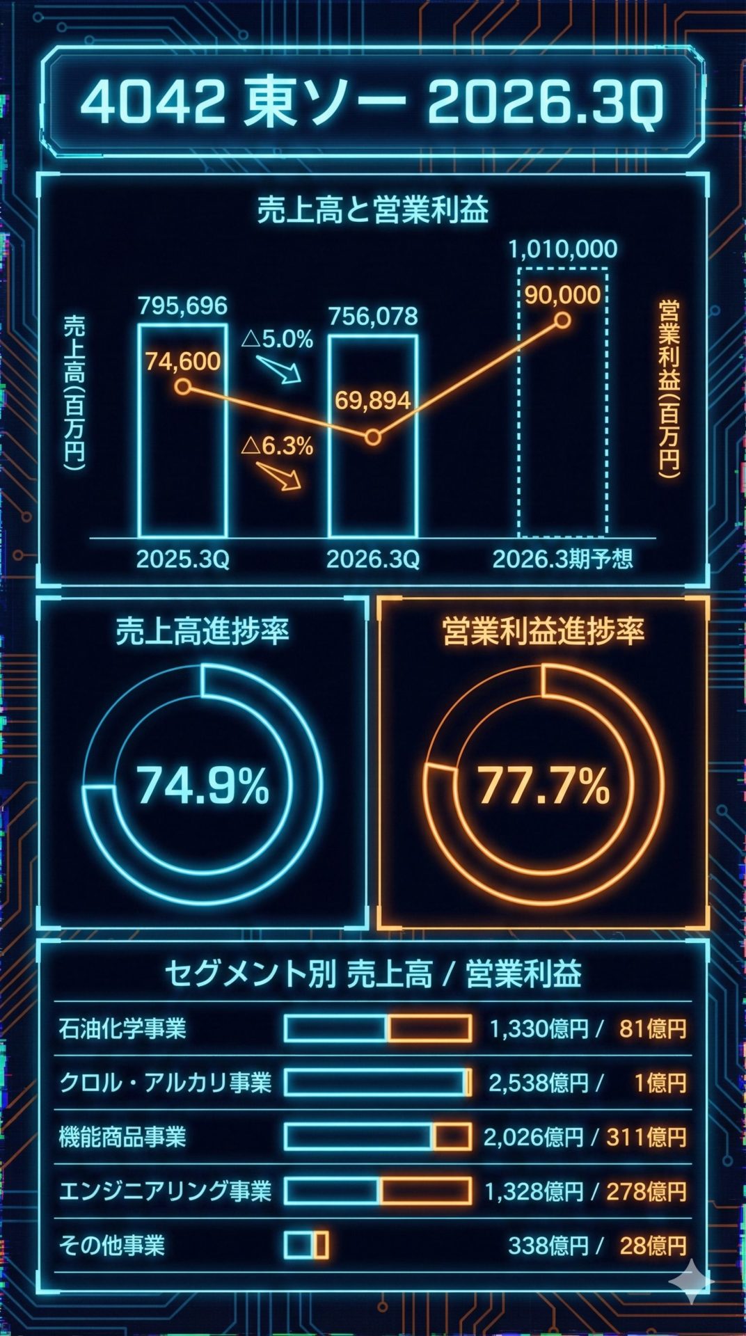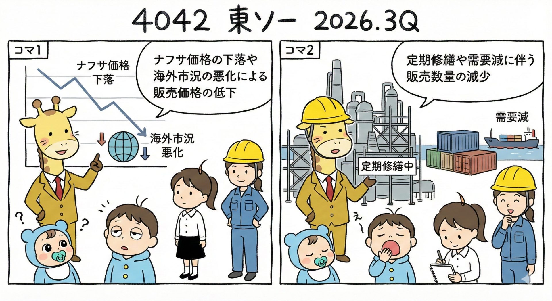 売上高は、ナフサ価格の下落や海外市況の悪化による販売価格の低下、および定期修繕や需要減に伴う販売数量の減少により、前年同期比で減収となりました 。