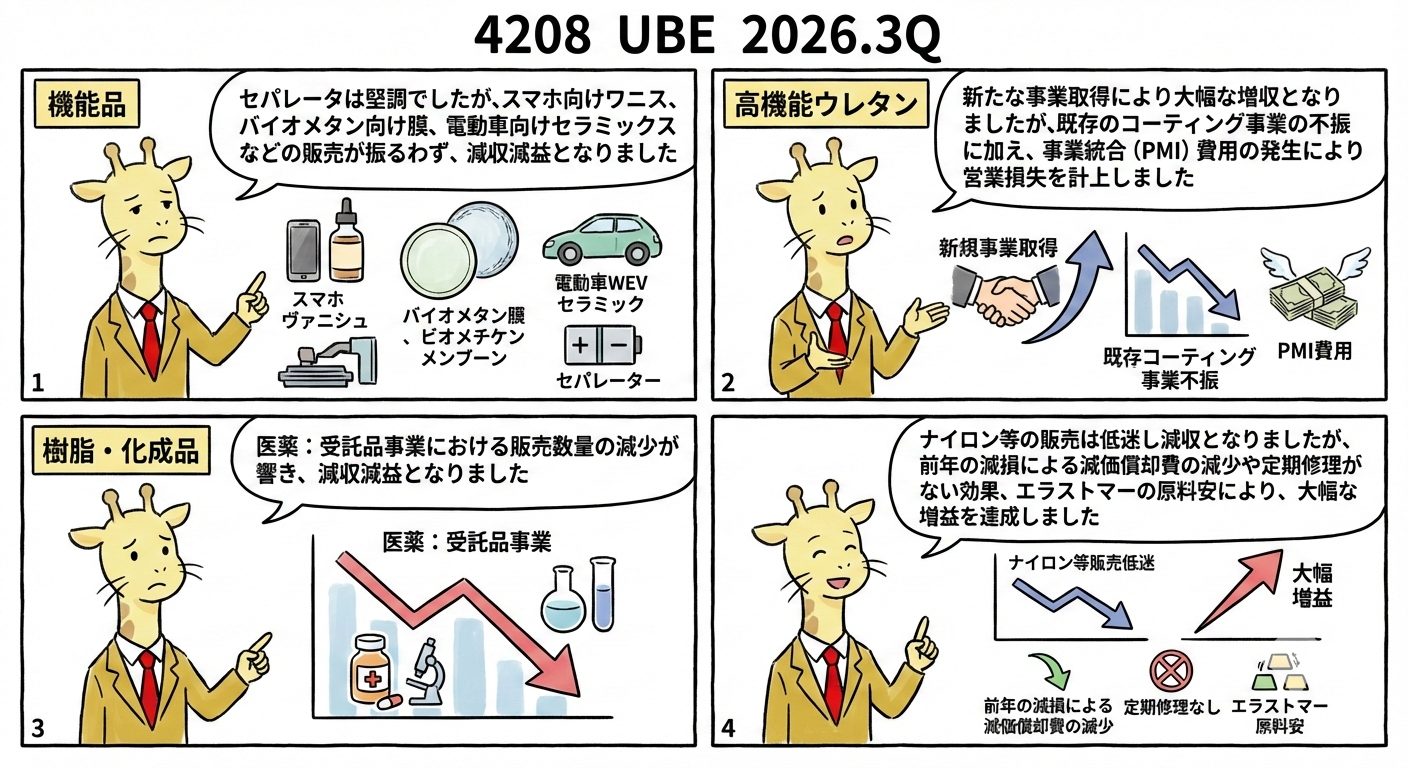 機能品: セパレータは堅調でしたが、スマホ向けワニス、バイオメタン向け膜、電動車向けセラミックスなどの販売が振るわず、減収減益となりました