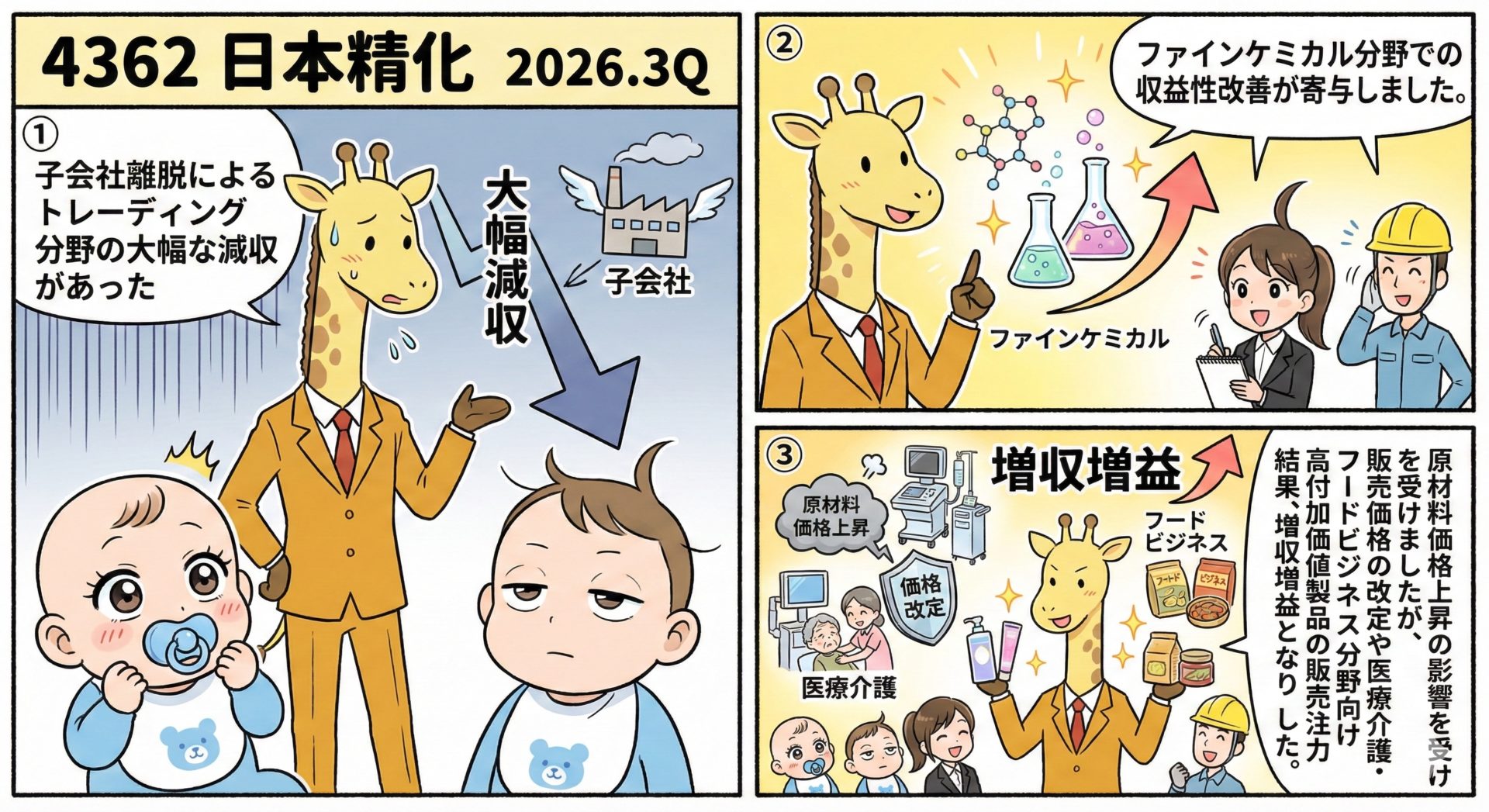 機能性製品: 子会社離脱によるトレーディング分野の大幅な減収があったものの、ファインケミカル分野での収益性改善が寄与し、セグメント全体では減収増益となりました