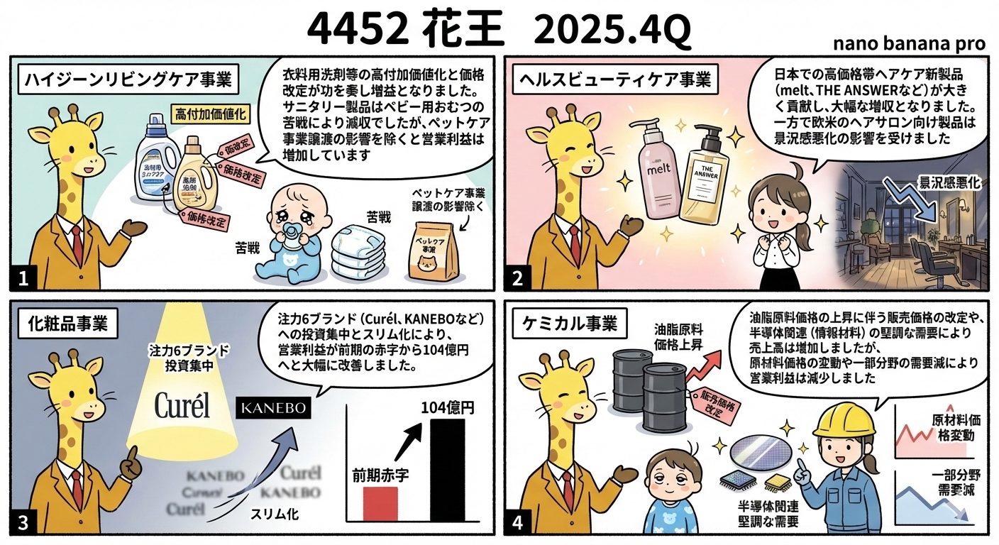 化粧品事業: 注力6ブランド(Curél、KANEBOなど)への投資集中とスリム化により、営業利益が前期の赤字から104億円へと大幅に改善しました。