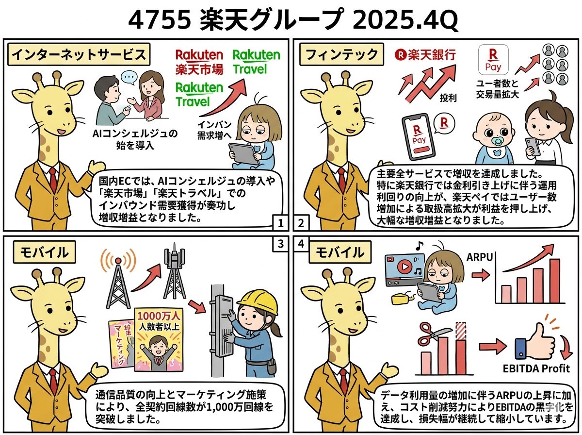 インターネットサービス:国内ECでは、AIコンシェルジュの導入や「楽天市場」「楽天トラベル」でのインバウンド需要獲得が奏功し増収増益となりました。海外でも「Rakuten Viber」の広告収益増などが成長に寄与しました。