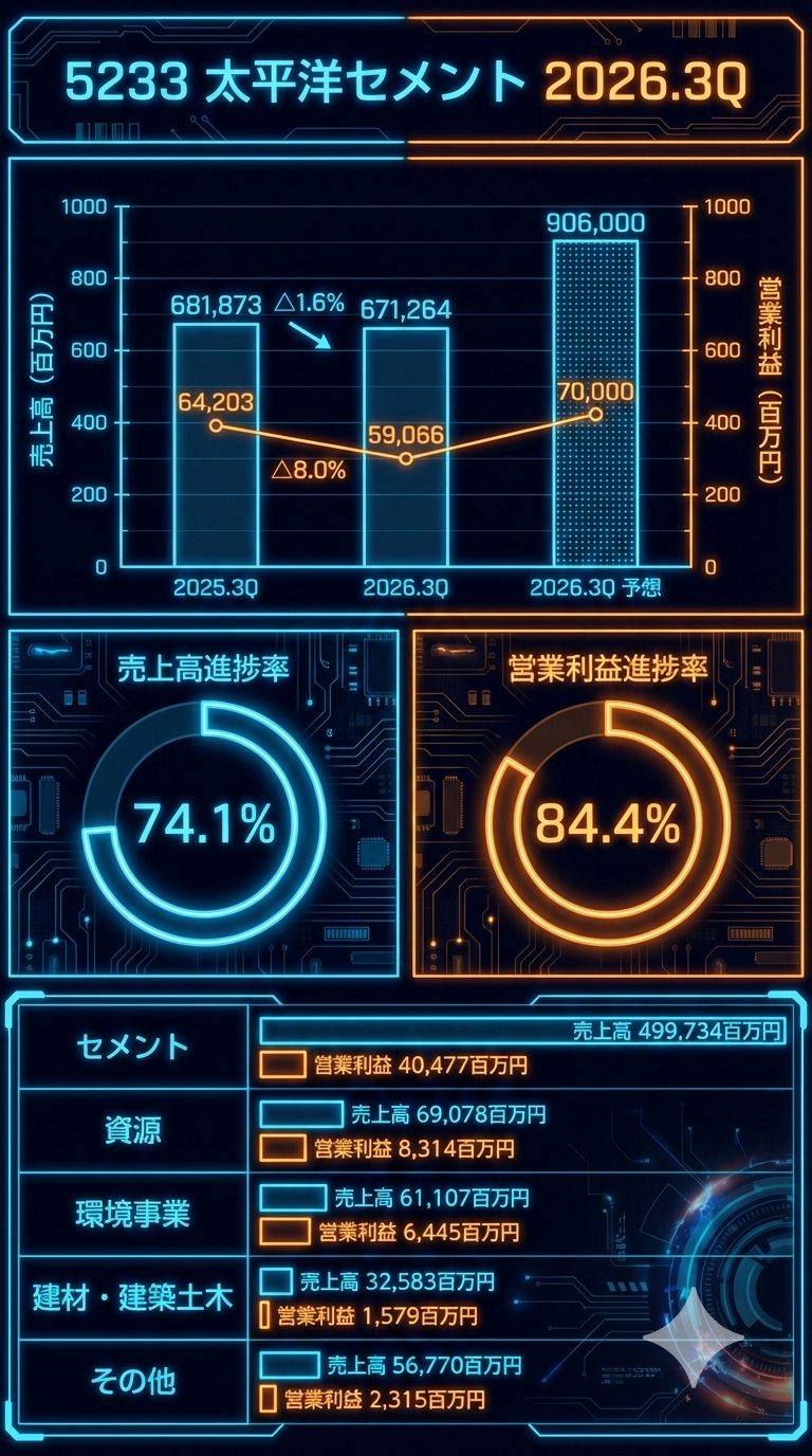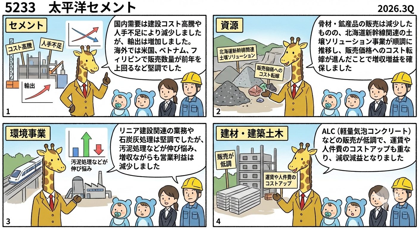 セメント:国内需要は建設コスト高騰や人手不足により減少しましたが、輸出は増加しました。海外では米国、ベトナム、フィリピンで販売数量が前年を上回るなど堅調でしたが、セグメント全体では減収減益となりました