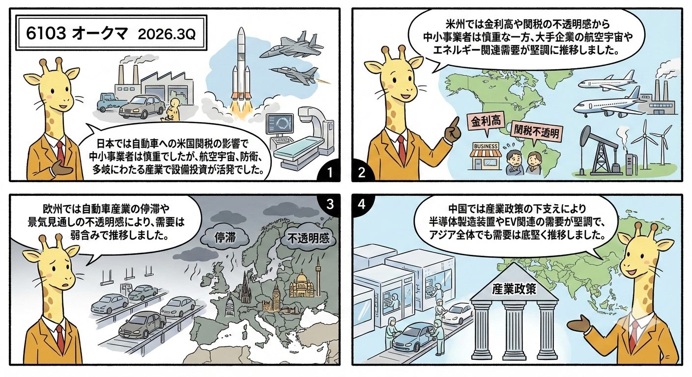 米州:金利高や関税の不透明感から中小事業者は慎重な一方、大手企業の航空宇宙やエネルギー関連需要が堅調に推移しました。