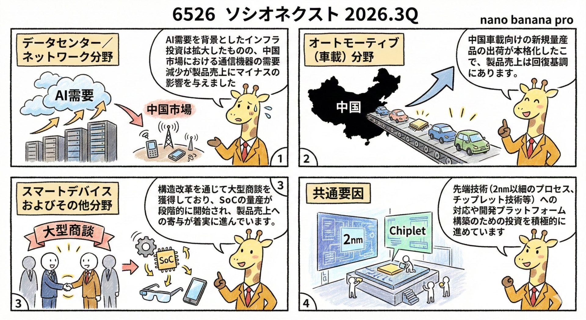 スマートデバイスおよびその他分野:構造改革を通じて大型商談を獲得しており、SoCの量産が段階的に開始され、製品売上への寄与が着実に進んでいます。