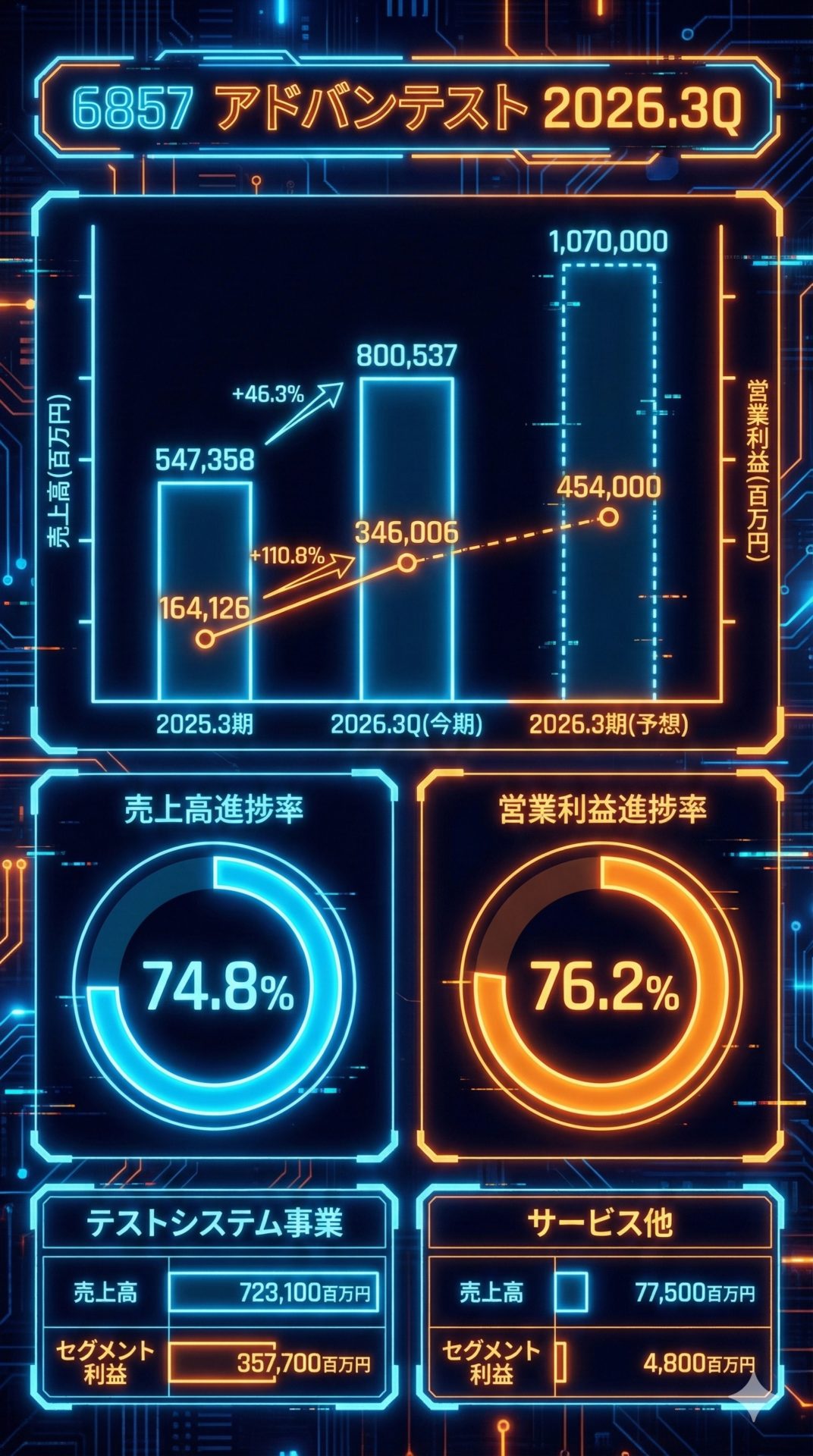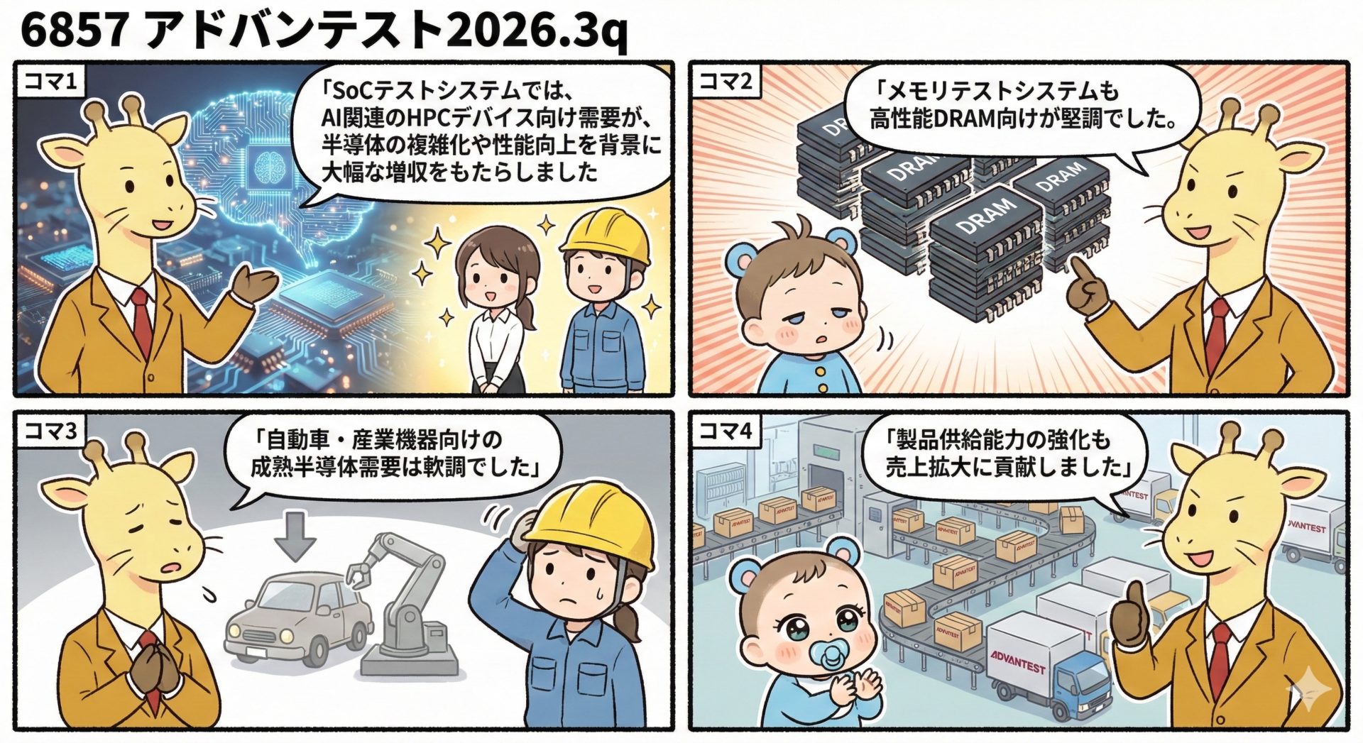 テストシステム事業: SoCテストシステムでは、AI関連のHPCデバイス向け需要が、半導体の複雑化や性能向上を背景に大幅な増収をもたらしました