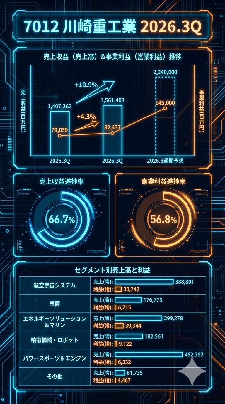 その他のセグメント: 航空宇宙、精密機械・ロボット、パワースポーツ等の詳細な増減要因については、提供された資料内には「決算説明資料に記載」との案内のみで、具体的な要因テキストは含まれていません