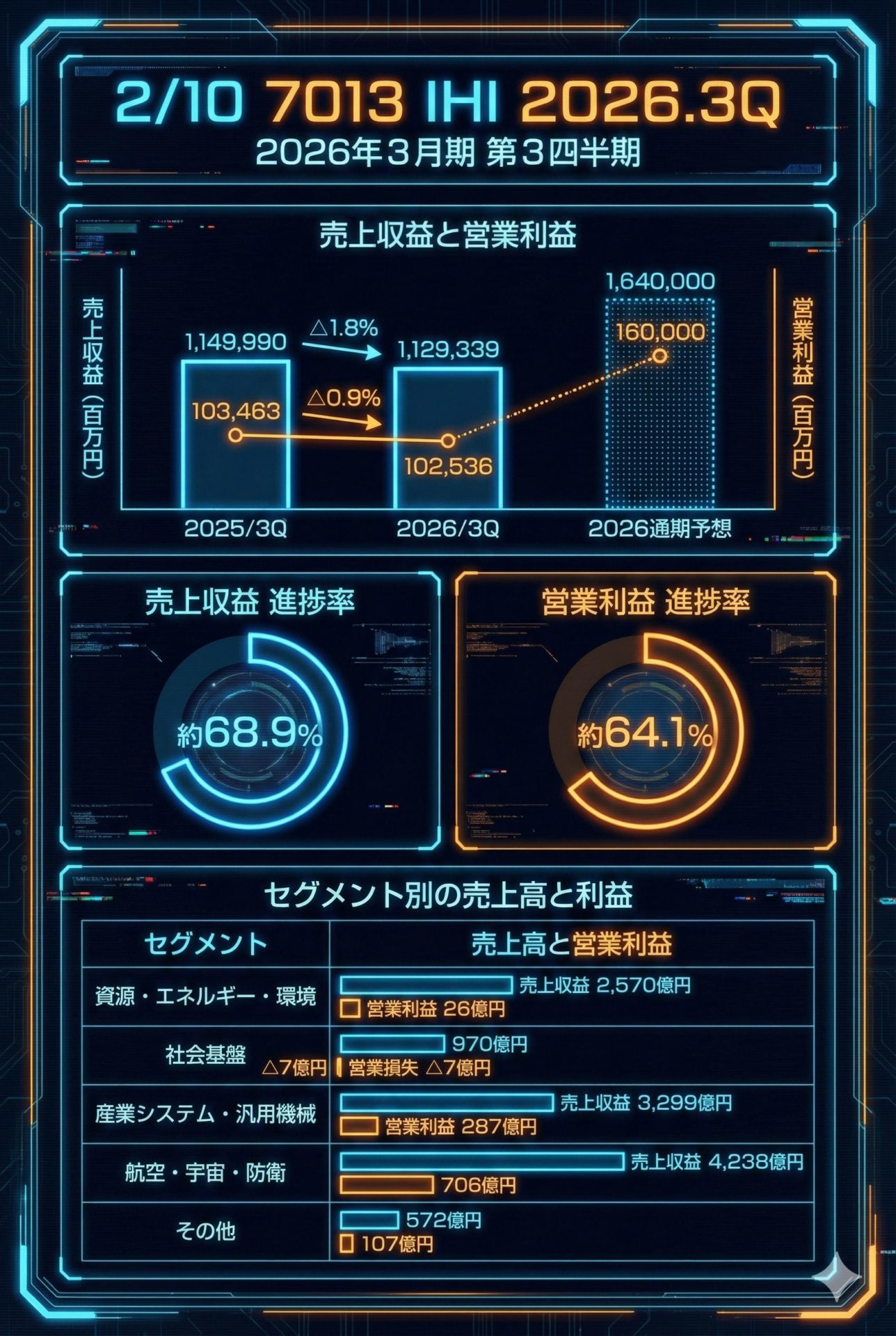 航空・宇宙・防衛: 売上収益 4,238億円、営業利益 706億円