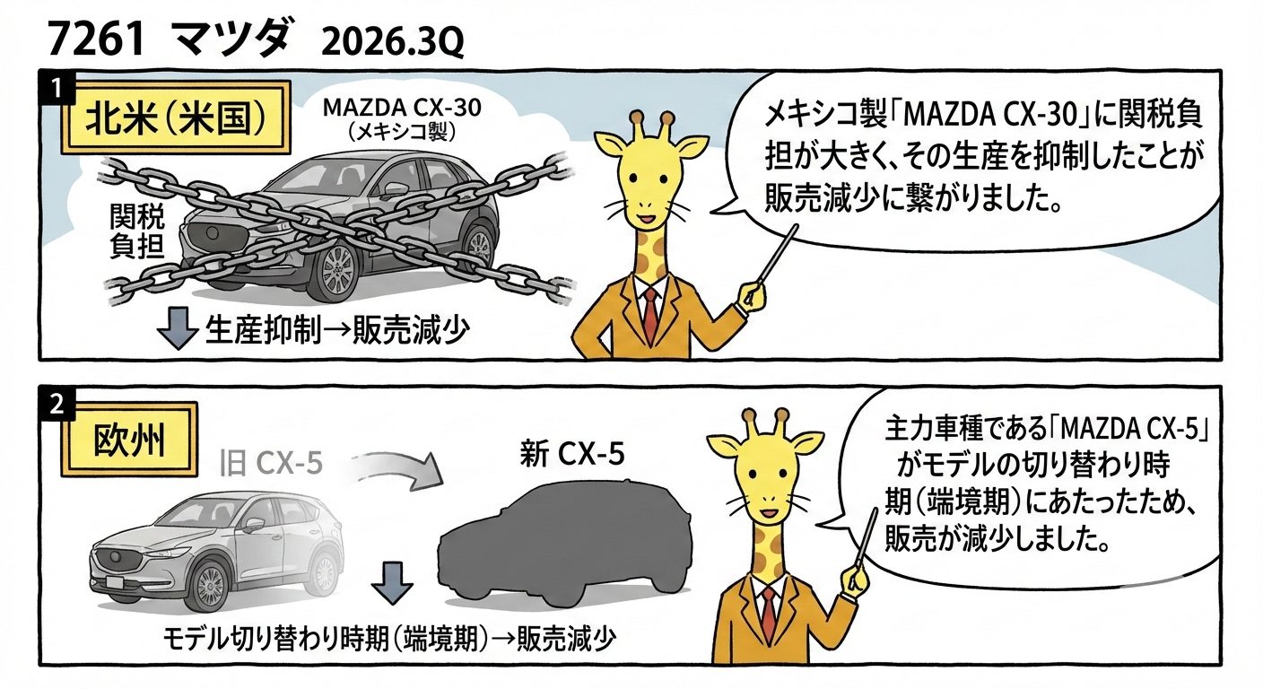 北米(米国): メキシコ製「MAZDA CX-30」に関税負担が大きく、その生産を抑制したことが販売減少に繋がりました。