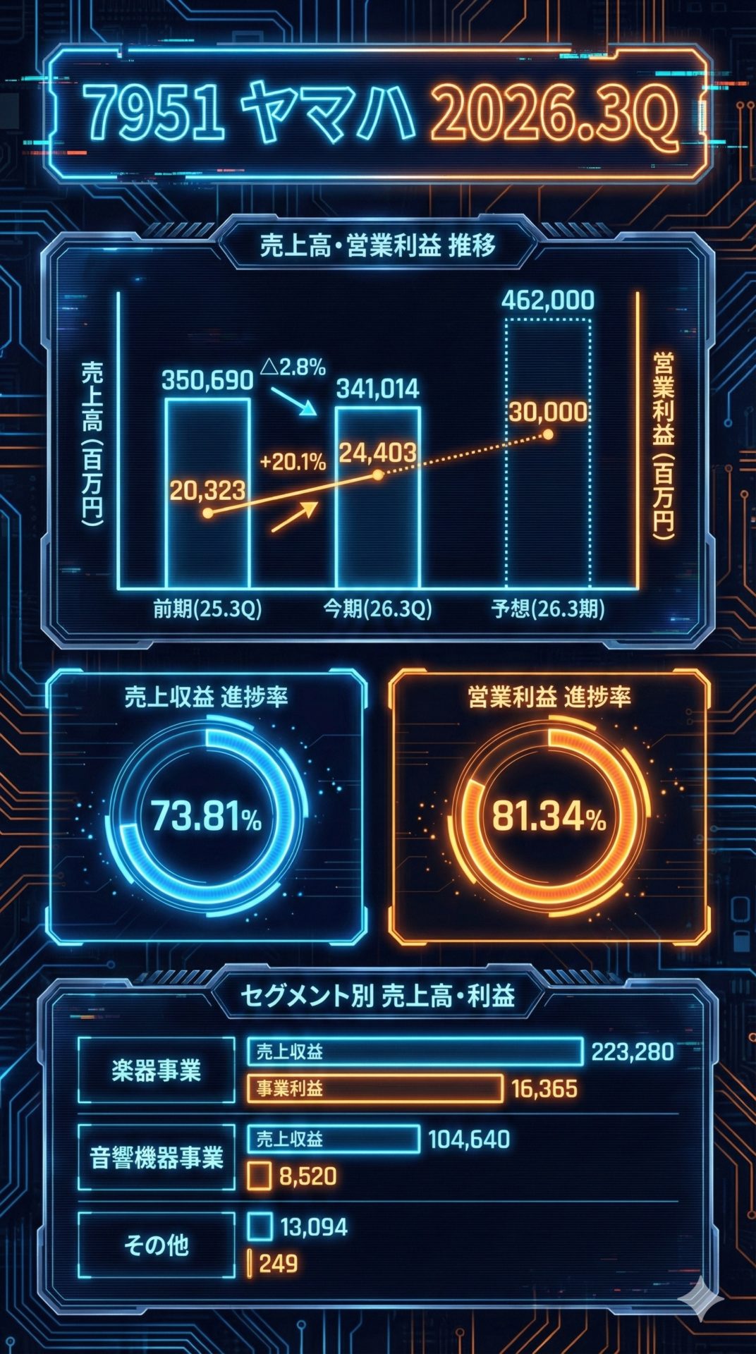 楽器事業: 売上収益 223,280 百万円、事業利益 16,365 百万円