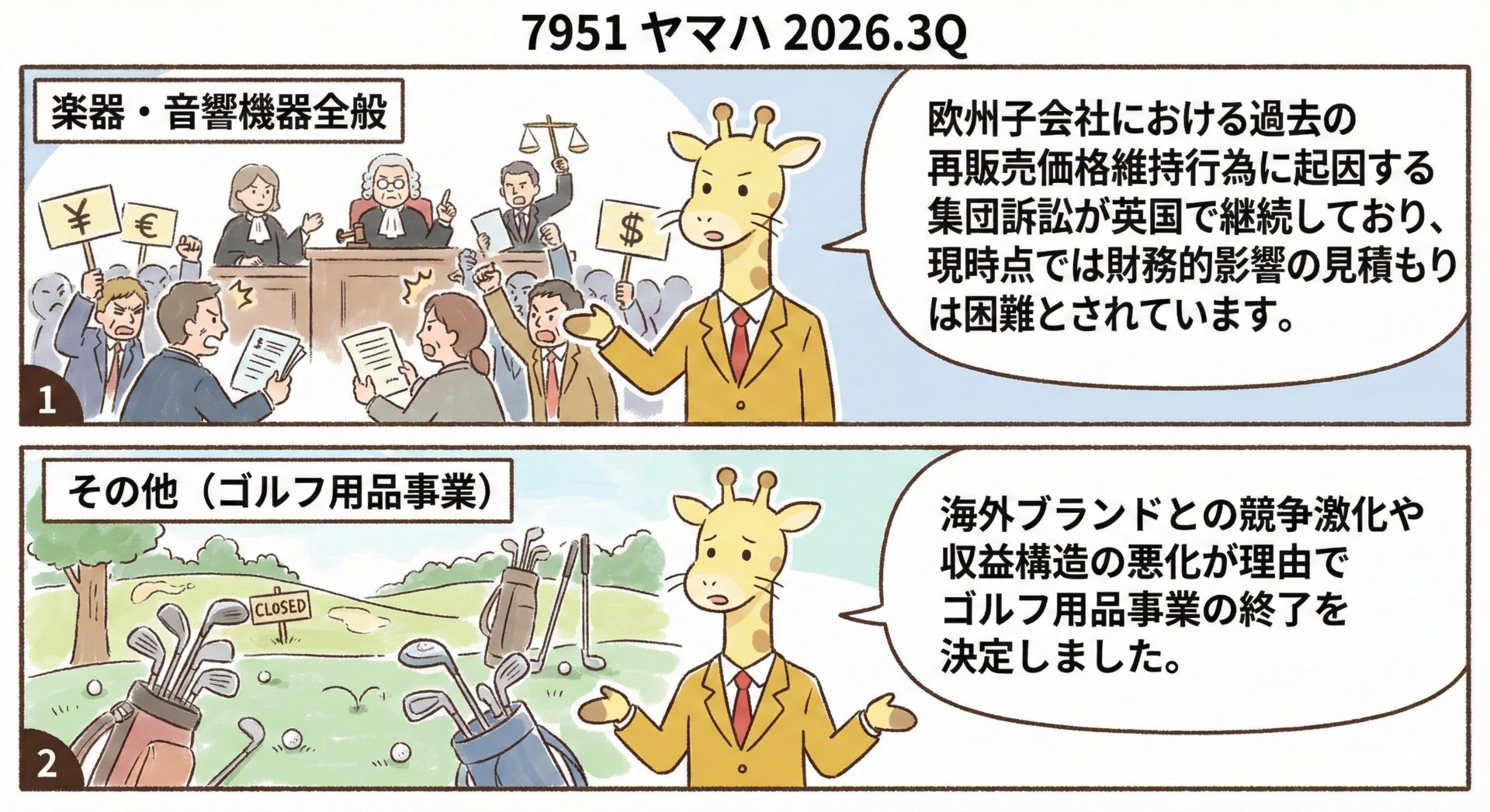 楽器・音響機器全般:欧州子会社における過去の再販売価格維持行為に起因する集団訴訟が英国で継続しており、現時点では財務的影響の見積もりは困難とされています。