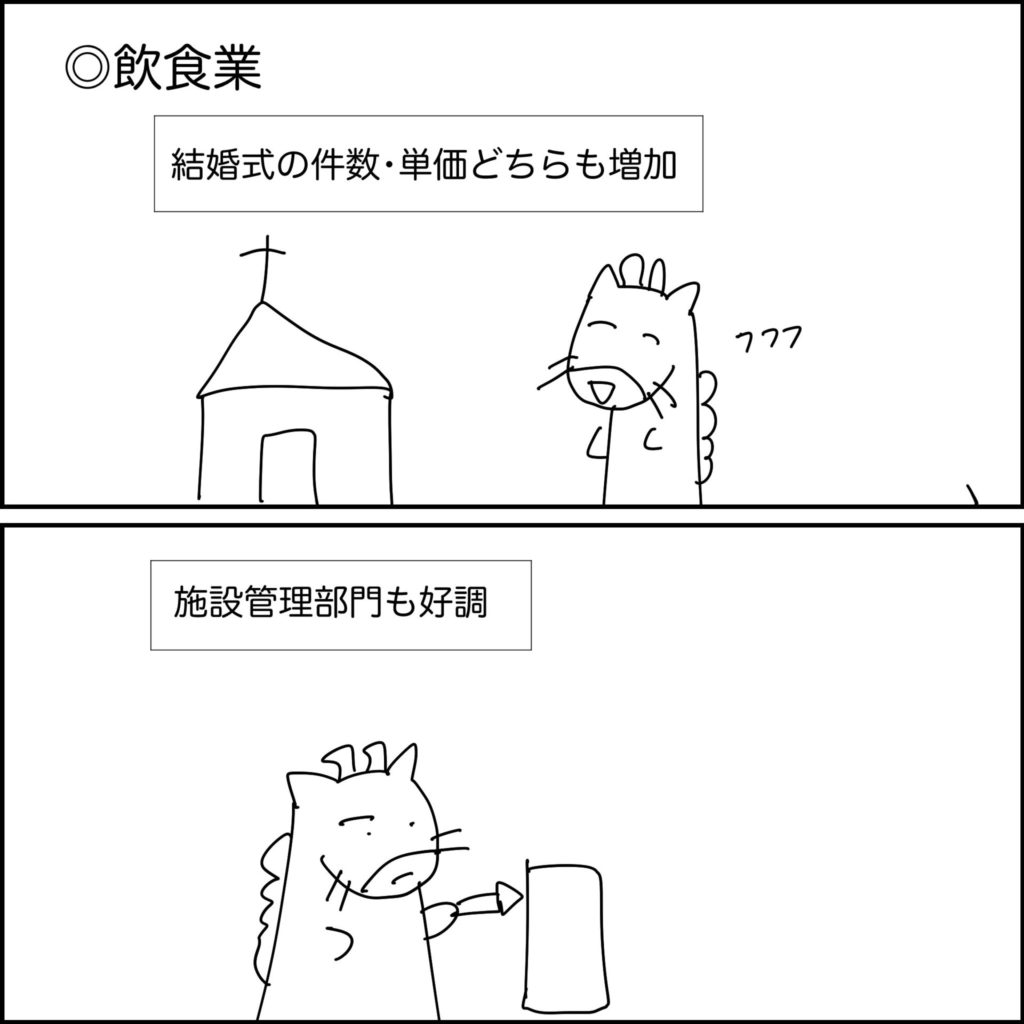 結婚式の件数と単価がどちらも伸びたことに加え、施設管理などの他部門も好調だったため、売上・利益ともに前年を上回りました。