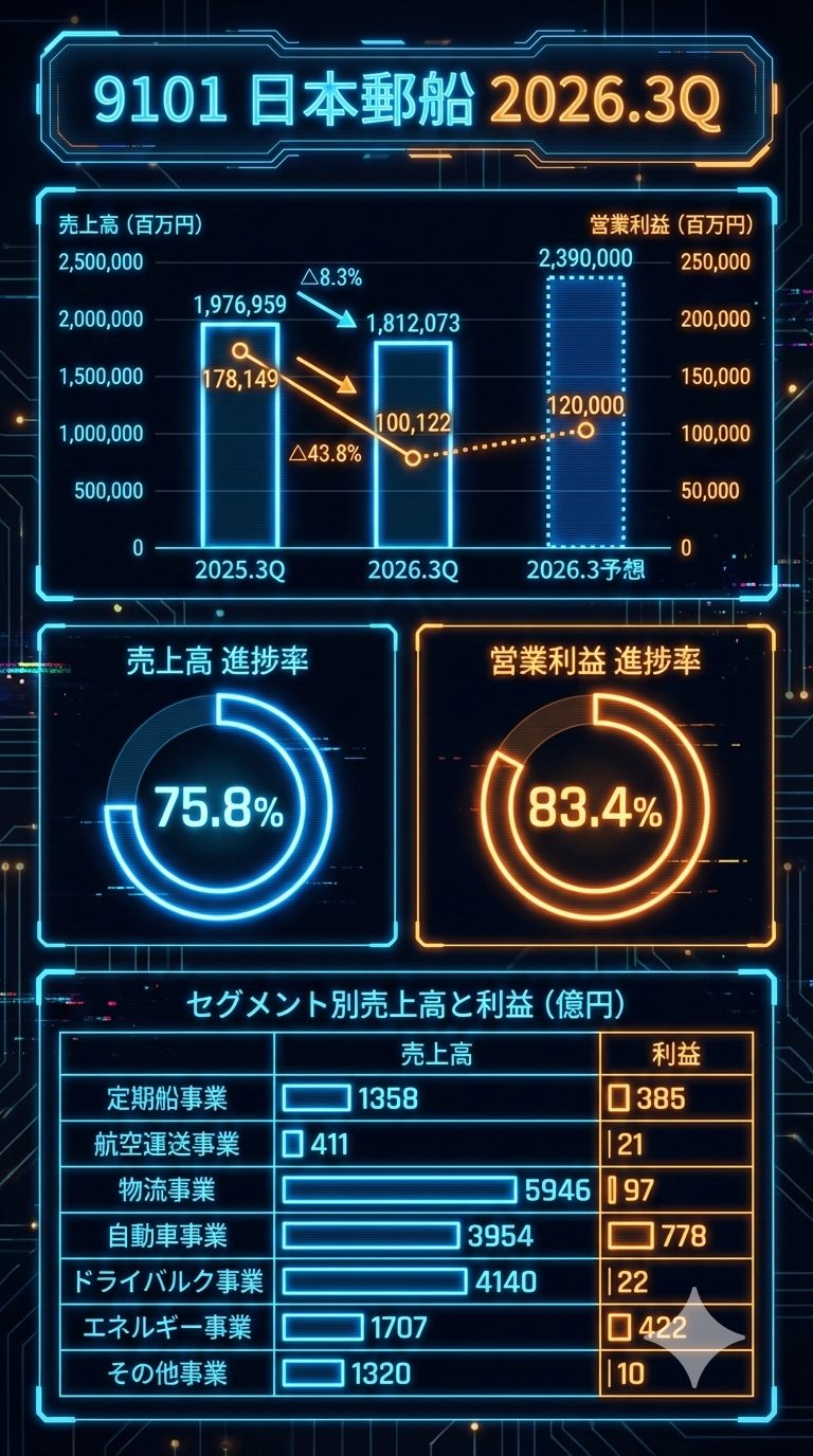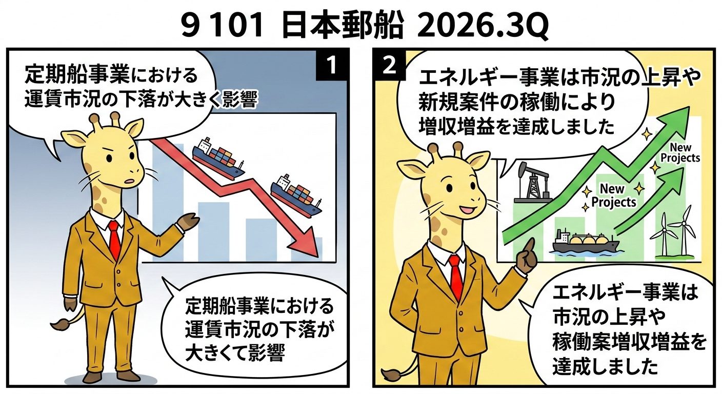 定期船事業:新造船の供給増加によりコンテナ船の運賃市況が下落し、ONE社の利益が減少したため減収減益となりました。