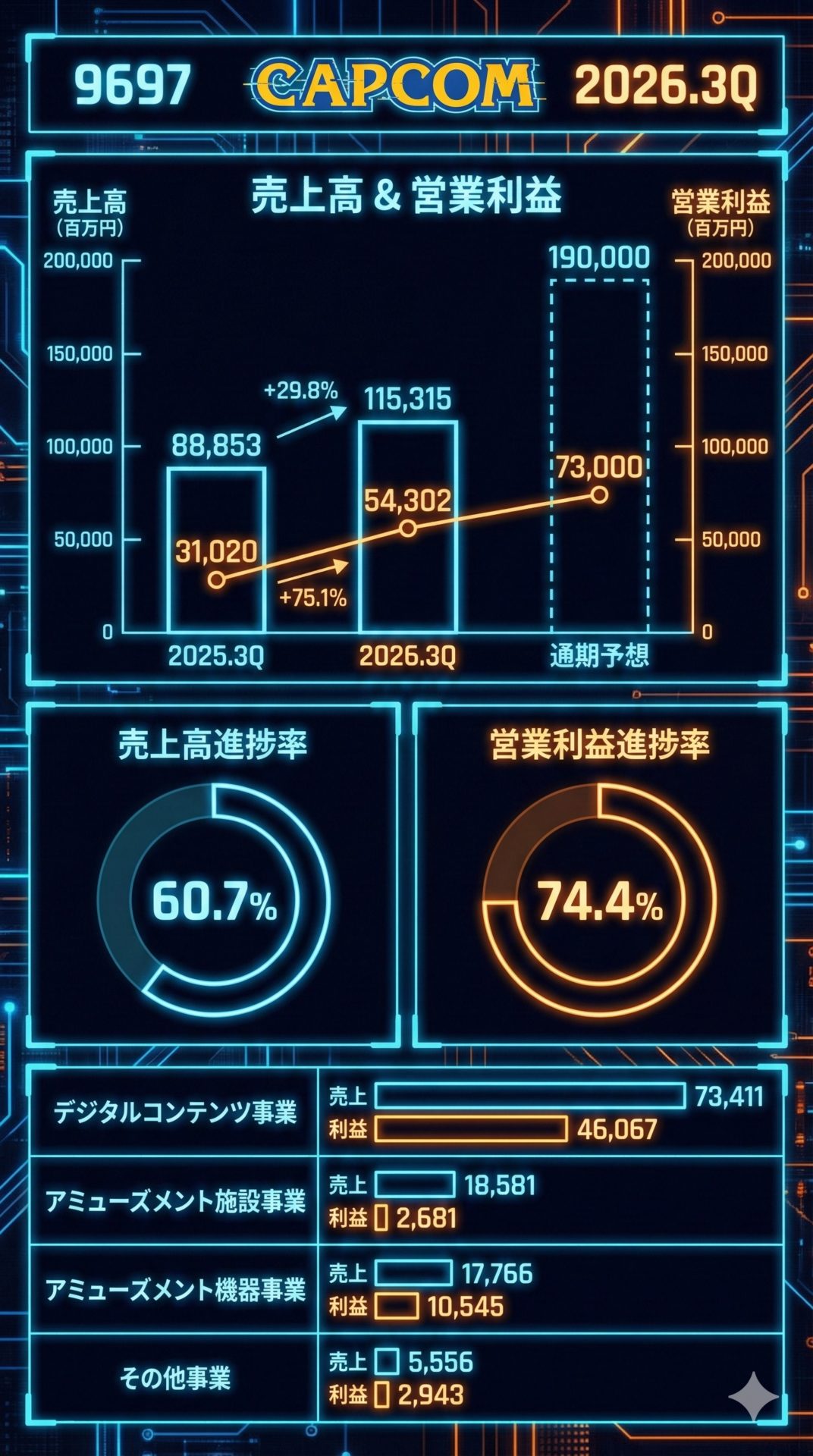 連結経営成績(累計)と連結業績予想の数字を使用した、第3四半期時点での進捗率は以下の通りです [1, 2]。