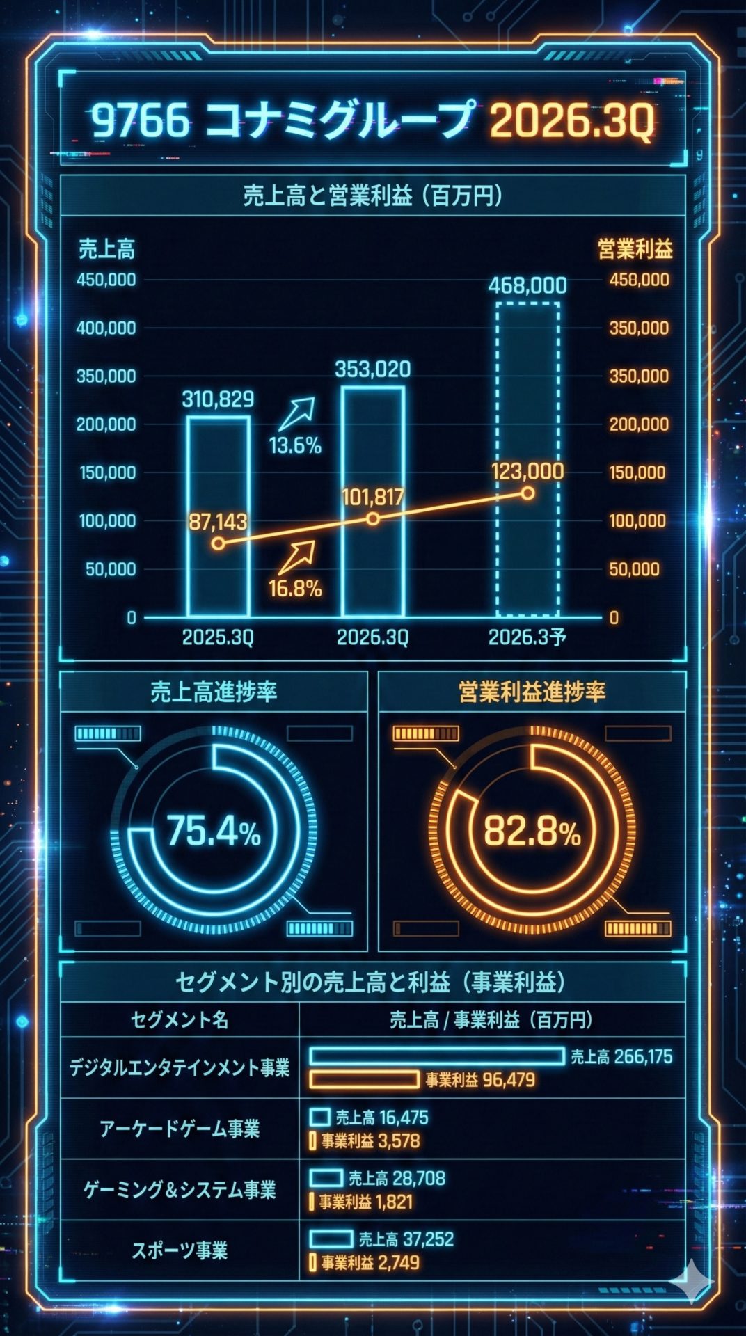デジタルエンタテインメント事業:「eFootball™」が国内外で好調を維持したほか、「桃太郎電鉄」の新作発売や「プロ野球スピリッツA」等の周年イベントが好評を博しました。また、世界大会などのeスポーツの取り組みもファン層の拡大に寄与しました 。