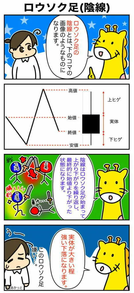 陰線とは市場が始まって上がり下がりを繰り返し、最終的に始値よりも株価が下がった状態のことを言います。