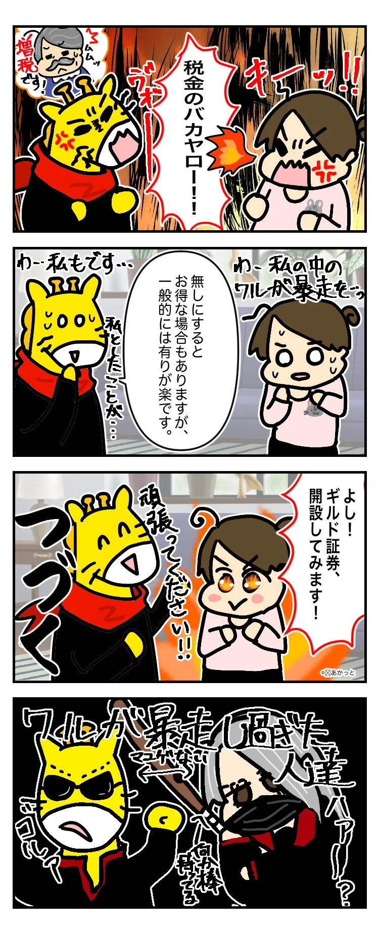 第1.5話:勇者まりりんちゃん投資を始める(長編) 2023 9/05 勇者まりりん 2023年1月17日2023年9月5日 ※本サイトはアフィリエイト広告・アドセンス広告を使用しています。1.5話(口座開設当サイトはSWELLを使用して作成しています。 勇者まりりん よかったらシェアしてね! URLをコピーしました! NISA制度について 初心者におすすめ本:ダイヤモンドzaiについて この記事を書いた人 あかっと 投資歴11年目です。(2024年現在) 今までバリュー投資やグロース株投資、債券、金投資など様々投資を経験しています。 その経験を踏まえて漫画と記事を書いています。 4歳児の育児漫画、趣味のDIYサイトも運営しています。 下記リンクより閲覧できます。 新着記事 勇者まりりん 第17話 銘柄によって着目点を変えることを学ぶ 2024年9月19日 勇者まりりん 第16話 結果で示す事を学ぶ 2024年7月2日 勇者まりりん 第15話 経験の大事さについて学ぶ 2024年5月28日 勇者まりりん 第14話 時間軸の話 2024年3月10日 勇者まりりん 第13話投資は余剰資金で 2024年2月28日 第12話:勇者まりりんストップ高とストップ安を経験する。 2024年1月16日 第11話:勇者まりりんドラゴン退治は簡単? 2023年11月14日 第10話:勇者まりりんキメラスライムに遭遇する。(TOB) 2023年11月9日
